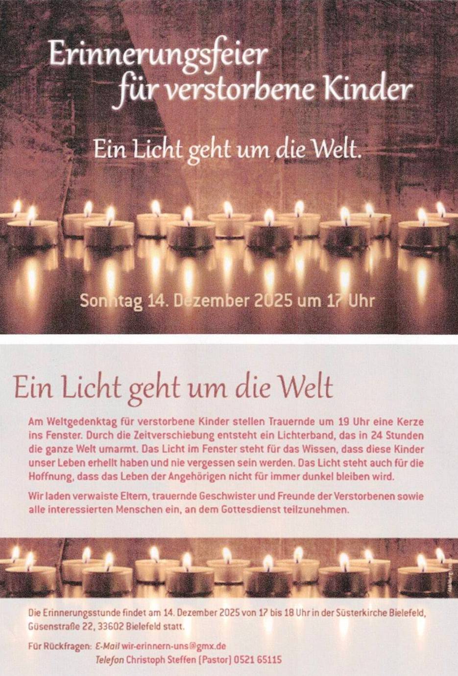Anlässlich des Weltgedenktags für verstorbene Kinder, finden in Bielefeld am Sonntag, 14. Dezember 2025, zwei Veranstaltungen statt.